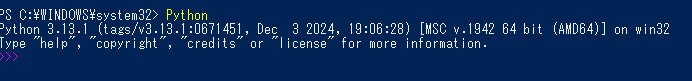 「>>>」と表示されれば、Pythonが正常に起動しています。