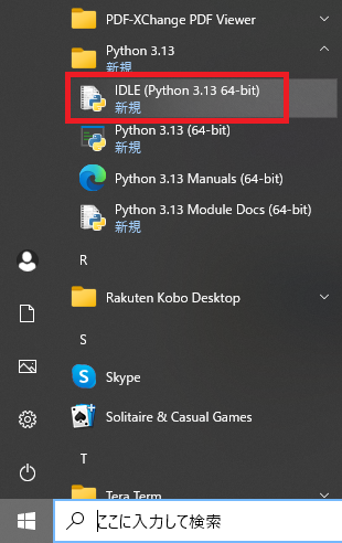 1.「スタート」→「Python3.x」→「IDLE(Python3.x)」をクリックします。