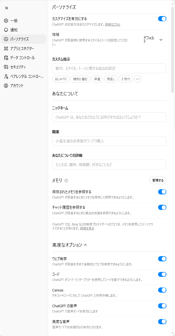 - 性格、カスタム指示・・・文体・形式・禁止事項など