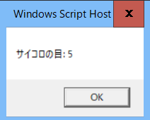 ' サイコロの面の数 Const MaxValue = 6 ' ランダムな数値を生成してサイコロの目を決定 Randomize DiceResult = Int((MaxValue * Rnd) + 1) ' 結果を表示 WScript.Echo "サイコロの目: " & DiceResult